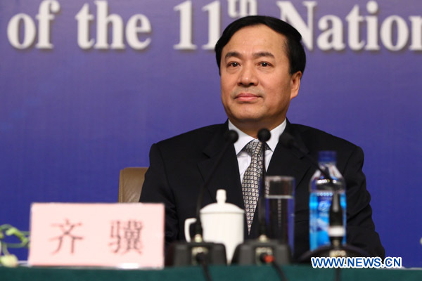 Qi Ji, vice minister of House and Urban-Rural Construction, attends a news conference of the Fourth Session of the 11th National People's Congress (NPC) focusing on indemnificatory housing construction and regulation of the real estate market in Beijing, capital of China, March 9, 2011.(Xinhua/Xing Guangli)