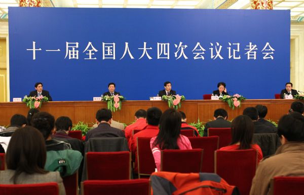 Li Fei (C), deputy director of the Legislative Affairs Commission of the National People's Congress (NPC) Standing Committee, Xin Chunying (2nd Right), deputy director of the Legislative Affairs Commission of the NPC Standing Committee, and Xu Xianming (2nd Left), president of Shandong University, attend a press conference of the Fourth Session of the 11th National People's Congress (NPC) on the formation and perfection of Socialist legal system with Chinese characteristics in Beijing, capital of China, March 10, 2011. (Xinhua/Chen Jianli)