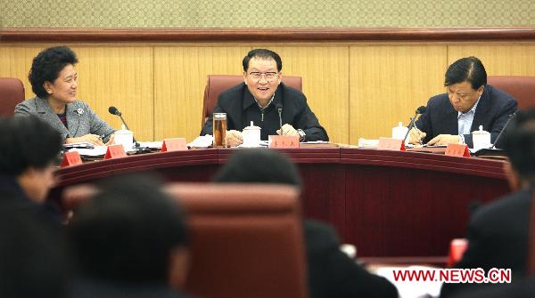 Li Changchun (C back), a member of the Standing Committee of the Political Bureau of the Communist Party of China (CPC) Central Committee, speaks at a meeting where officials made arrangements for cultural and ideological work in 2011, in Beijing, capital of China, Jan. 13, 2011. (Xinhua/Yao Dawei)