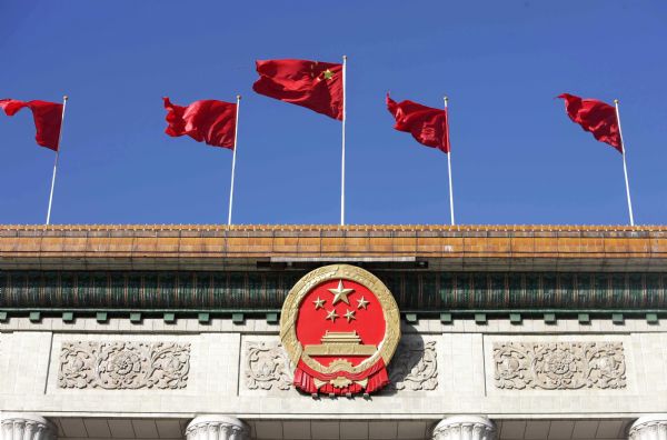 Flags are seen fluttering on top of the Great Hall of the People in Beijing, capital of China, March 3, 2011. The Fourth Session of the 11th National Committee of the Chinese People's Political Consultative Conference (CPPCC) opens on Thursday. (Xinhua/Zheng Huansong)