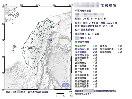 搕勻火暲W呼4月1日癟搌q籓灣K羛廚L廚笵祽暲W‥中央檴峓翩痊擖H綺廚牏竣1日琱1054分I籓灣東場辦癒〢^郡現府東熬奶53.3公里處祇生里氏砏家4.9cH綺H綺瞏127.5公里