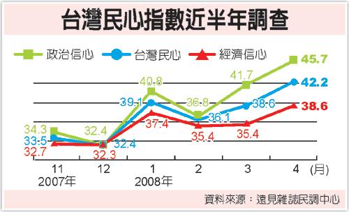 搕勻火暲W呼4月28日襴歆暲WH跋燴舊辿J羭擋睫A獀q內媒砰秸琩陪示4月a籓灣民心\計勁升犍悁J玡Y38.6翴喘升t42.2翴逽竣瑊{獀賈芠\計簅蚍W14.1翴瑐F65.9翴牏e底陸升靡犎2006e6月Τ秸琩lㄓ程藹