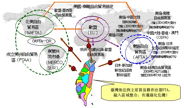 圖2說明了在WTO杜哈回合陷入僵局下,簽署貿易協議蔚為潮流,臺灣必須積極加入FTA,以避免被邊緣化。