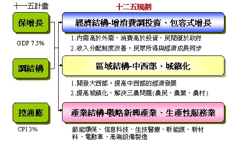 十二五規劃期間是中國大陸企圖改變國內外經濟產業發展規律的明顯轉折點。就國際層面而言,中國大陸希望轉變少數先進國家主導的國際經濟格局,這反映在自主創新╱產業標準、人民幣國際化、與國際趨于同步發展新興產業等方面。就其內部而言,中國大陸正面對國內多種結構性瓶頸或矛盾,重視經濟、產業和社會層面的平衡發展。故政策上強調加速轉變經濟發展模式,重視調結構、擴內需、包容性增長、國民所得倍增。此外,面對中國大陸的崛起與十二五規劃的發展方向,臺灣必須因勢利導有所作為,但也要謹慎以對。未來兩岸經濟與產業交流也勢必要跳脫以往的基本思考方向與互動模式。未來,兩岸產業與經濟交流的演進應超越既有脈絡與格局,要有新內涵,故需有“新思維”、“新夥伴關係”、“新合作模式”與“新治理架構”。