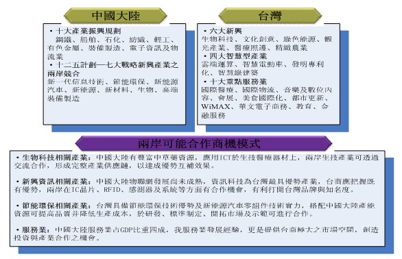 在兩岸合作上,科技產業的對接合作、傳統產業的升級轉型,以及服務業質量的提升來擴大內需,均有合作的空間。但如何建立合作的機制,並透過ECFA的深化與廣化,以及政策的松綁,才能落實兩岸廠商、產業的合作,以因應挑戰及開啟新的商機。