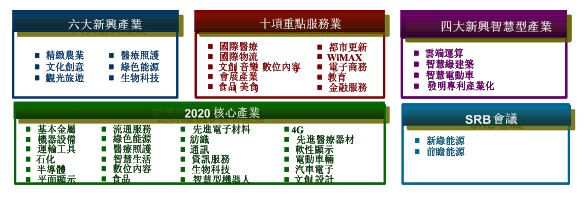 目前規劃之六大新興產業、十項重點服務業、四大新興智能型產業及2020年規劃之核心產業,主要方向請參見圖10。
