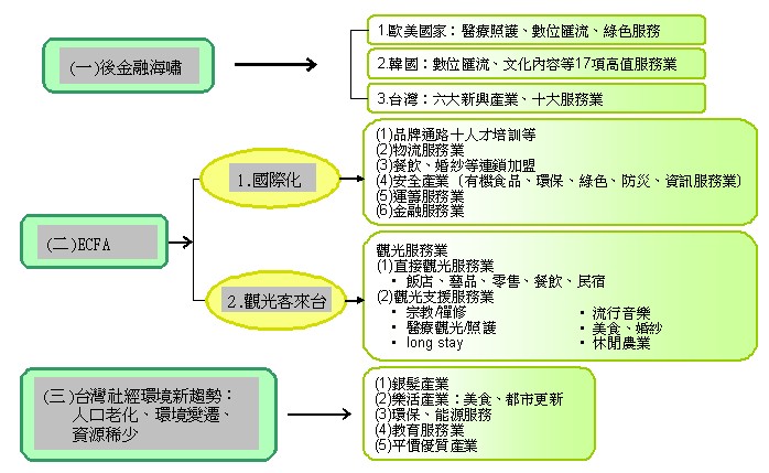 在新興服務業上,後金融海嘯、後ECFA及因應人口老化、環境變遷及資源稀少上,具潛力的服務業如圖11所示。