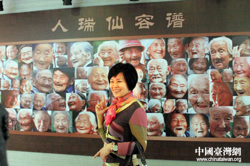 與會嘉賓在如皋百歲以上長壽老人的影像前留影。(中國臺灣網 楊麗 攝)