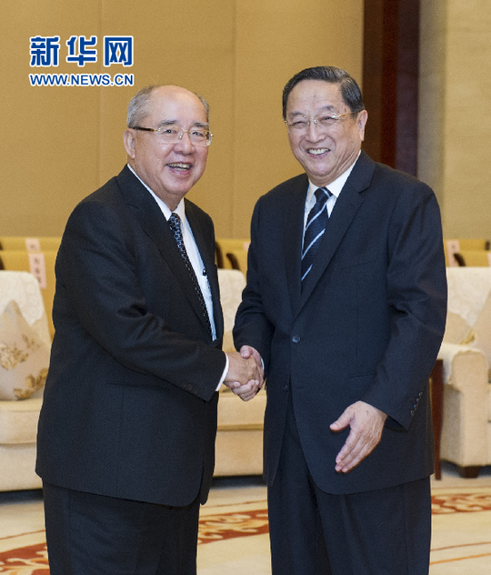10月25日,中共中央政治局常委、全國政協主席俞正聲在南寧會見前來出席第九屆兩岸經貿文化論壇的中國國民黨榮譽主席吳伯雄一行。新華社記者 王曄 攝