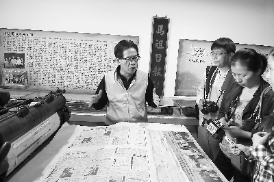 圖為馬祖日報社長宋志富(左一)向參觀者介紹傳統的報紙鉛印歷史。圖片來源:《福建日報》