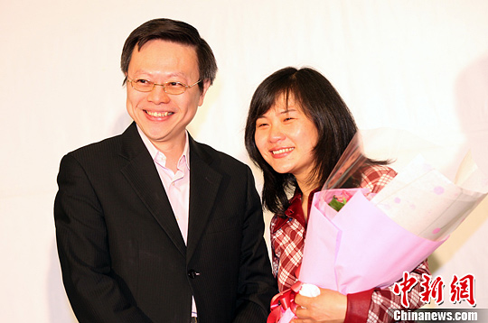 4月9日,臺北,臺灣“陸委會”主委王鬱琦(左)向大陸配偶李正霞獻花。中新社發 董會峰 攝