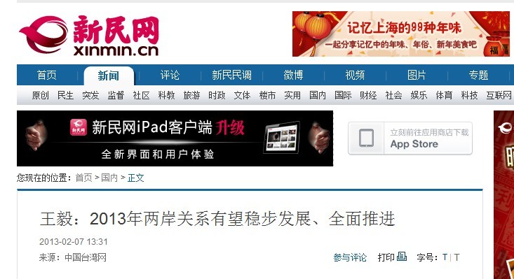 王毅說,回首2012,我們倍感喜悅與欣慰,兩岸關係可謂繼往開來,成果豐碩。展望2013,我們充滿信心和期待,兩岸關係有望穩步發展,全面推進。王毅表示,新的一年,我們將繼續鞏固兩岸雙方的共同政治基礎,確保兩岸關係沿著正確方向穩步向前發展;我們將繼續擴大兩岸交流合作,推動兩岸關係在各個領域都取得更為全面的進展。我們還將本著以人為本、為民謀利的理念,繼續為臺灣同胞多辦實事和好事,不斷增進兩岸民眾福祉,深化兩岸同胞感情。由衷期待兩岸同胞齊心協力,團結奮鬥,攜手開創兩岸關係和平發展新局面,共同譜寫中華民族偉大復興新篇章。