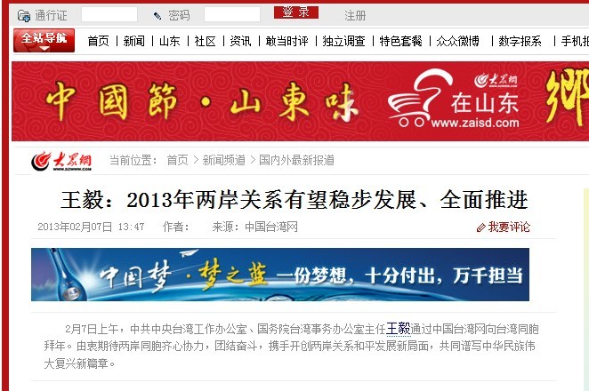 王毅說,回首2012,我們倍感喜悅與欣慰,兩岸關係可謂繼往開來,成果豐碩。展望2013,我們充滿信心和期待,兩岸關係有望穩步發展,全面推進。王毅表示,新的一年,我們將繼續鞏固兩岸雙方的共同政治基礎,確保兩岸關係沿著正確方向穩步向前發展;我們將繼續擴大兩岸交流合作,推動兩岸關係在各個領域都取得更為全面的進展。我們還將本著以人為本、為民謀利的理念,繼續為臺灣同胞多辦實事和好事,不斷增進兩岸民眾福祉,深化兩岸同胞感情。由衷期待兩岸同胞齊心協力,團結奮鬥,攜手開創兩岸關係和平發展新局面,共同譜寫中華民族偉大復興新篇章。