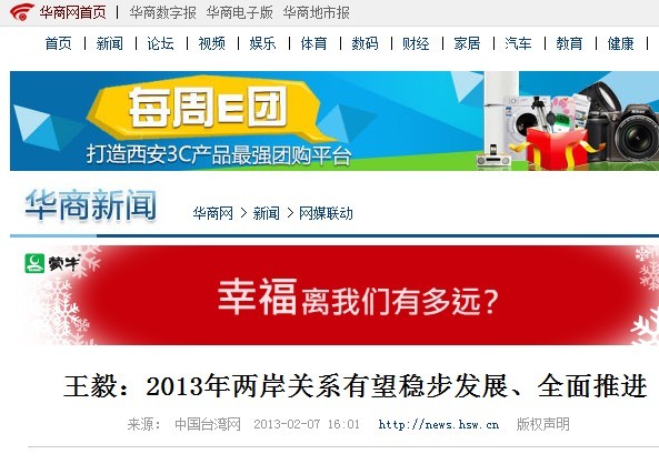 王毅說,回首2012,我們倍感喜悅與欣慰,兩岸關係可謂繼往開來,成果豐碩。展望2013,我們充滿信心和期待,兩岸關係有望穩步發展,全面推進。王毅表示,新的一年,我們將繼續鞏固兩岸雙方的共同政治基礎,確保兩岸關係沿著正確方向穩步向前發展;我們將繼續擴大兩岸交流合作,推動兩岸關係在各個領域都取得更為全面的進展。我們還將本著以人為本、為民謀利的理念,繼續為臺灣同胞多辦實事和好事,不斷增進兩岸民眾福祉,深化兩岸同胞感情。由衷期待兩岸同胞齊心協力,團結奮鬥,攜手開創兩岸關係和平發展新局面,共同譜寫中華民族偉大復興新篇章。