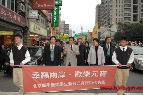 寶島臺灣有史以來最大規模的元宵走街活動,以兩岸師生同慶的形式,于2011年2月17日在新竹市文化廣場拉開序幕。屆時將有當地十幾萬民眾民俗走街鬧元宵,北京市臺辦領導率第四屆中華文化快的北京260名師生,與新竹師生及民眾共同走街遊行,共同慶賀新春佳節元宵節,此次在寶島臺灣舉辦的“第四屆中華文化快車----兩岸師生元宵走街”也是兔年伊始兩岸青少年民俗文化互動的盛舉。