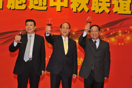 北京市臺辦主任汪明浩(左)、臺灣海基會董事長林中森(中)和北京臺資企業協會理事長林清發向京臺兩地嘉賓祝酒(孟福祥 攝)