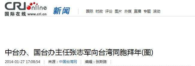 [國際在線]中臺辦、國臺辦主任張志軍向臺灣同胞拜年(圖)