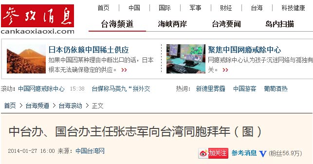 [參考消息]中臺辦、國臺辦主任張志軍向臺灣同胞拜年(圖)