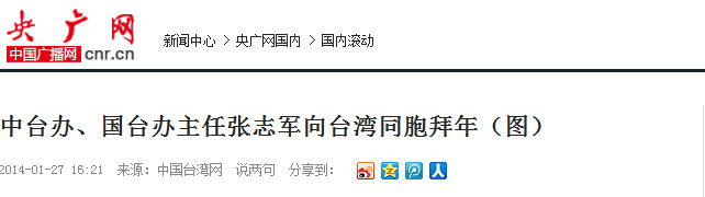中國臺灣網1月27日北京消息 中共中央臺灣工作辦公室、國務院臺灣事務辦公室主任張志軍27日通過中國臺灣網發表新春賀詞,向廣大臺灣同胞拜年。全文如下: