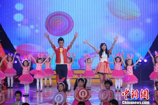 中新社福州2月9日電 在“喜氣羊羊·小樣陪你過新年——‘兩岸小圍爐’2015福建少兒春節聯歡晚會”錄制現場,一群可愛的“小羊寶寶”和“糖果寶寶”,圍繞著臺灣東森幼幼電視臺的太陽哥哥和月亮姐姐,用甜蜜笑容和輕快舞步,將整個大舞臺點綴得花團錦簇、春意融融。