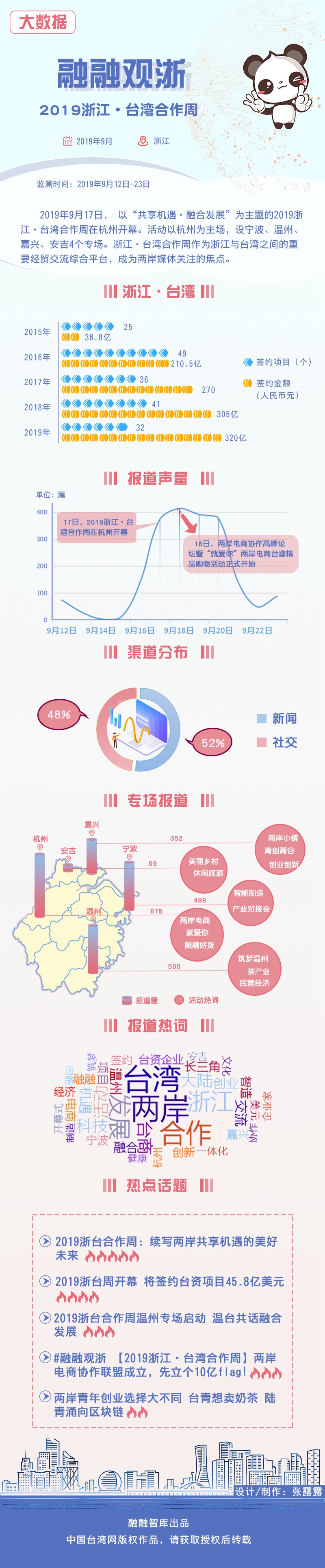 2019年9月17日, 以“共享機遇·融合發展”為主題的2019浙江·臺灣合作周在杭州開幕。活動以杭州為主場,設寧波、溫州、嘉興、安吉4個專場。浙江·臺灣合作周作為浙江與臺灣之間的重要經貿交流綜合平臺,成為兩岸媒體關注的焦點。