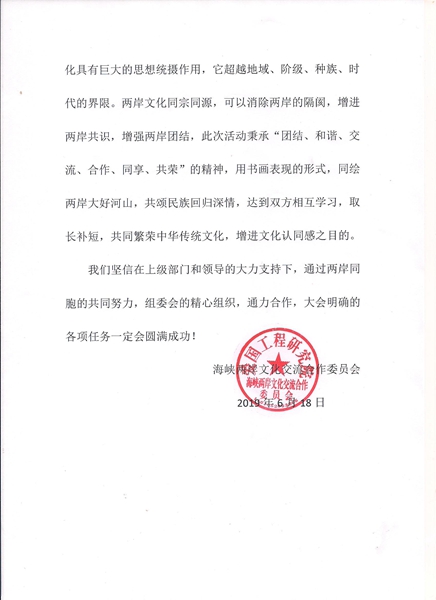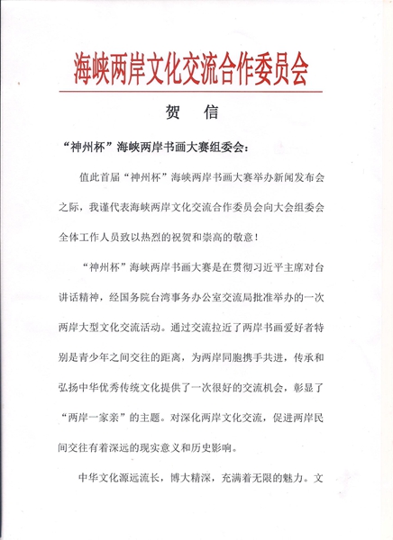 海峽兩岸文化交流合作委員會向書畫大賽組委會發來賀信