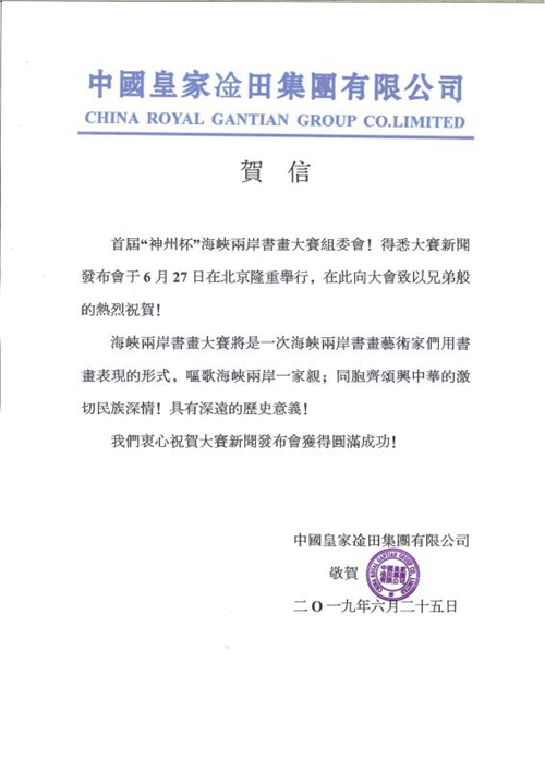 中國皇家凎田集團有限公司向大賽組委會發來賀信