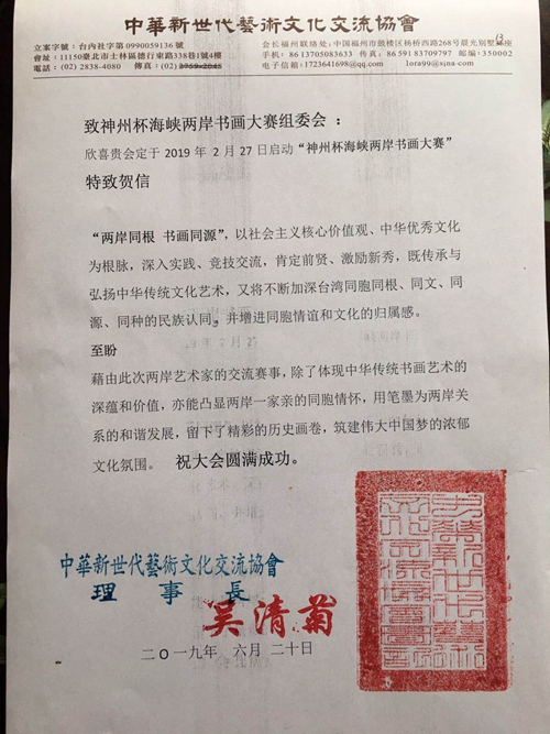 中華新世代藝術文化交流協會向大賽組委會發來賀信