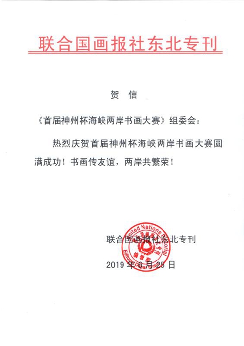 中國臺灣網6月25日訊 由九州文化傳播中心、福建省廣播影視集團等多家單位主辦的《首屆“神州杯”海峽兩岸書畫大賽》活動日前啟動,聯合國畫報社東北專刊向大賽組委會發來賀信。
