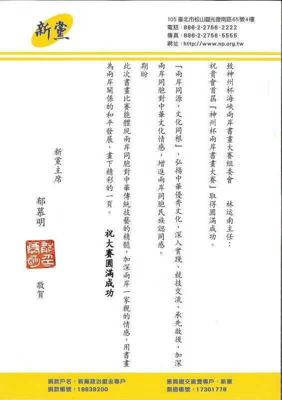 新黨主席鬱慕明向大賽組委會發來賀信