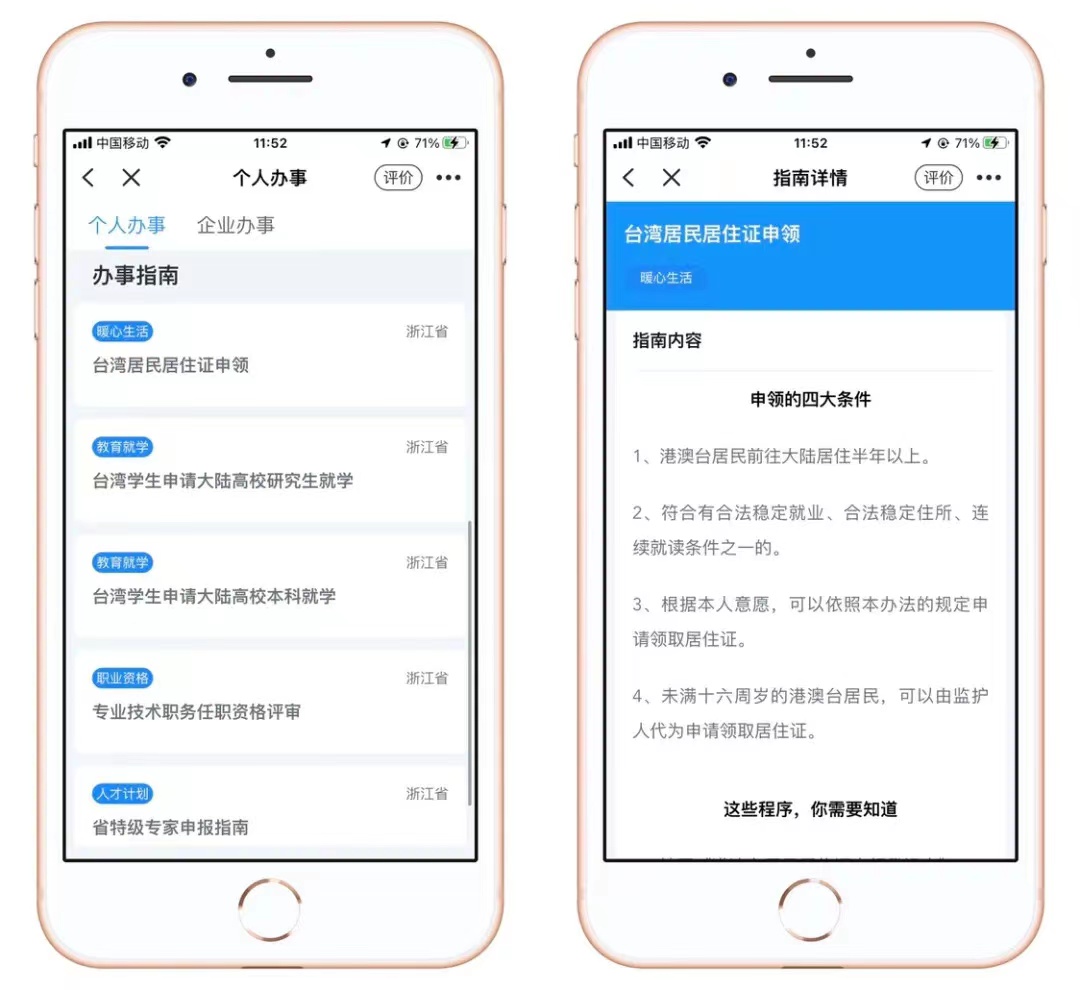 “個人辦事”欄目涉及臺胞醫療健康、教育就學、交通出行、法律服務、就業創業等服務領域,基本覆蓋臺胞在浙學習生活、就業創業日常辦事的高頻事項。