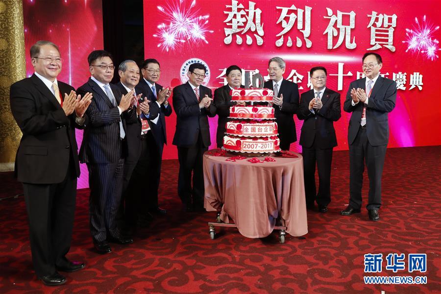 2017年5月24日,全國臺企聯成立十周年慶典晚會在京舉辦。當日,中共中央臺辦、國務院臺辦主任張志軍(右三)、海峽兩岸關係協會會長陳德銘(左五)、全國臺企聯會長王屏生(右四)、臺灣三三會會長江丙坤(左四)等出席慶典晚會。當日,全國臺灣同胞投資企業聯誼會成立十周年慶典晚會在北京飯店舉行。 新華社記者沈伯韓攝