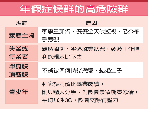 島內醫師指出,有春節恐慌症的不外乎大家庭的媳婦、不孕族及不婚族等,前者想到要應付一大家族年節吃喝、善後就手軟;後者多半是不耐家族成員一再追問不婚、不孕原因,幹脆過年上班,樂得耳根清靜。