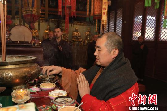 此前一天,五臺山佛教協會會長、五臺山著名寺院黛螺頂主持昌善法師拈香開始了傳統迎新春普供法會。 焦瑾琦 攝