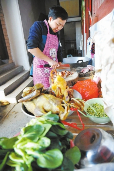 東南網2月4日報道(福建日報記者 遊慶輝 攝影)“許多親戚來家里拜年,我和家人從下午兩點多開始,殺魚、洗雞、摘青菜,給客人準備晚餐。”2月1日,從廈門攜家帶口回到龍岩永定大溪鄉聯合村的陳日東邊切肉邊說道,而他大哥也在廚房內忙著炒菜。五點多,兩桌豐盛的菜肴終于完成,阿東一家人和親戚相聚在圓桌前,倒上客家米酒,舉起杯,相互說著祝福的話,新裝修好的房子里洋溢著濃鬱的親情。