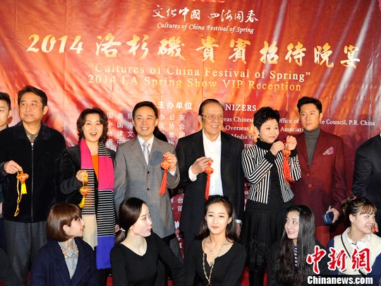 當地時間2月5日,參加“文化中國四海同春”2014洛杉磯新春晚會的演員抵達洛杉磯,董文華等著名歌唱家在當晚舉行的招待會上受到當地各界僑胞的熱烈歡迎。