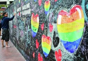 2月13日,在澳大利亞悉尼,一名男子在一面寫滿情人節留言的涂鴉牆上寫字。 新華/法新