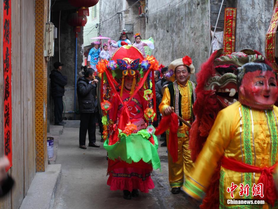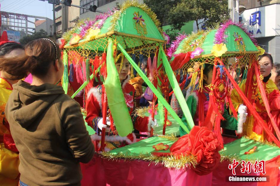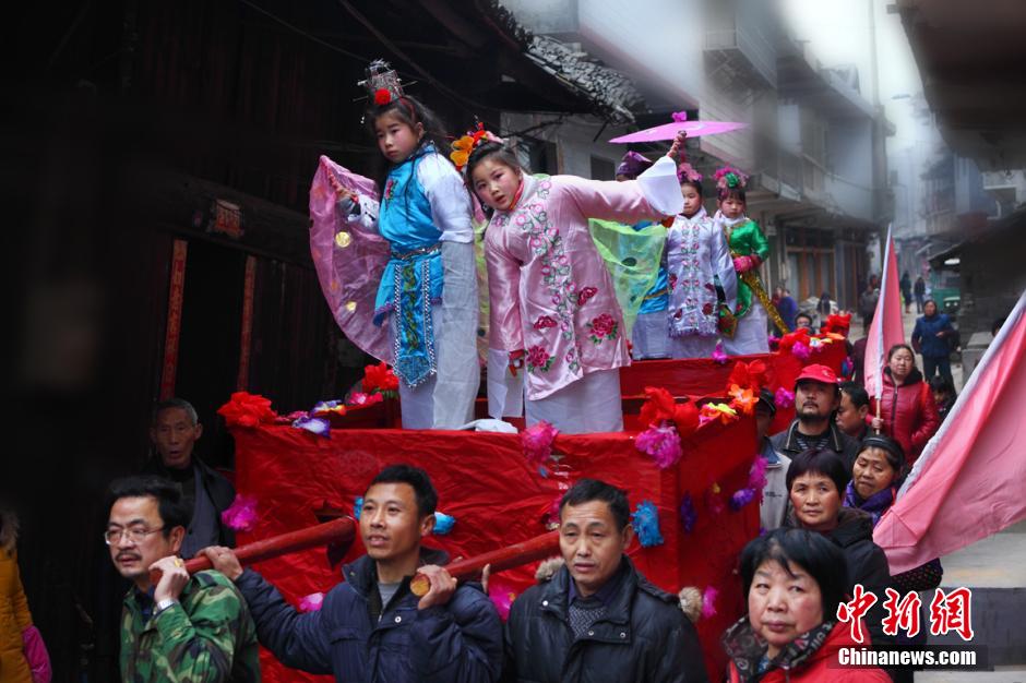 2月4日,大年初五,湖南湘西八大古鎮之一的瀘溪縣浦市古鎮開展了豐富多彩的“抬故事”、“彩龍船”、“女子龍燈”等民俗文化節目。據了解,為豐富馬年春節期間民眾的文化生活,從大年初一至初七,瀘溪縣組織了一係列城鄉民俗民間文化巡遊活動,讓數十萬群眾飽嘗新春“文化大餐”。向民貴 張克寧 攝