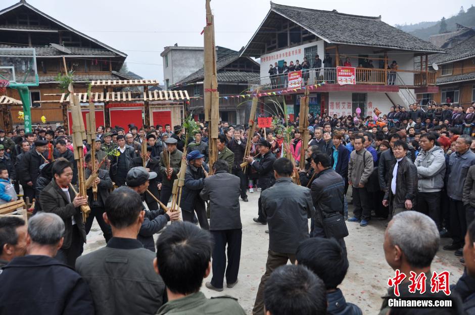 2月4日,廣西三江侗族自治縣林溪鄉牙己村,來自湘桂交界30余個侗苗村寨數千名少數民族同胞歡聚一堂,以月也、多耶、蘆笙踩堂、百家宴等民族特色縱情歡度新春。圖為歡奏蘆笙。龔普康 攝