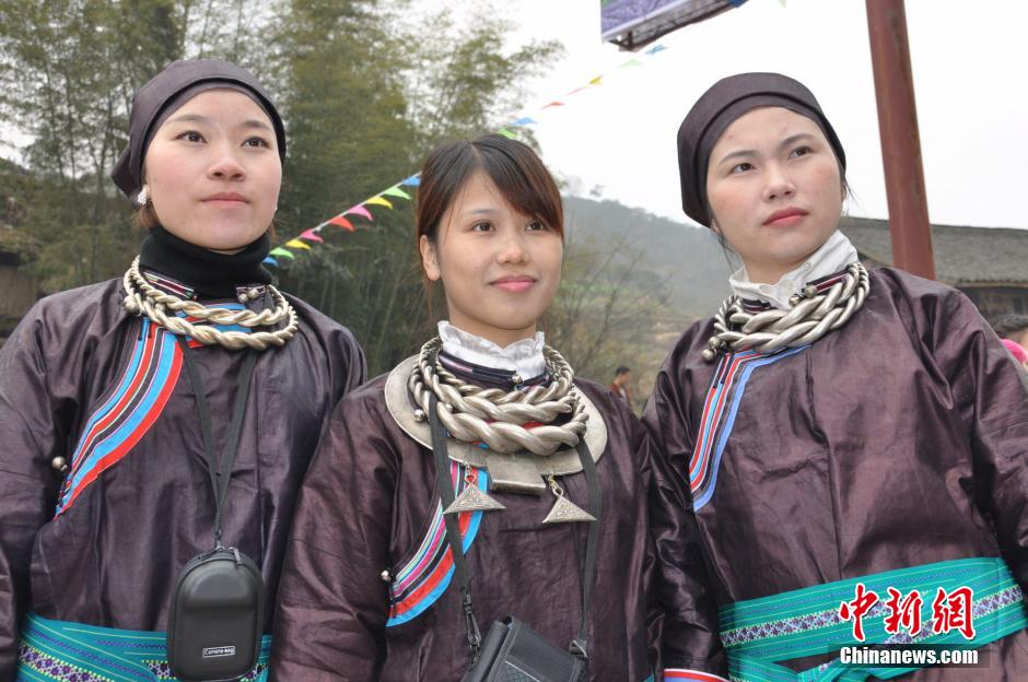 2月4日,廣西三江侗族自治縣林溪鄉牙己村,來自湘桂交界30余個侗苗村寨數千名少數民族同胞歡聚一堂,以月也、多耶、蘆笙踩堂、百家宴等民族特色縱情歡度新春。圖為苗族姑娘。龔普康 攝
