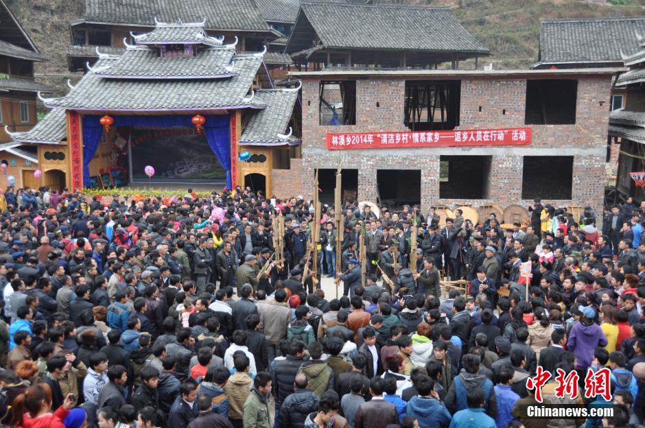 2月4日,廣西三江侗族自治縣林溪鄉牙己村,來自湘桂交界30余個侗苗村寨數千名少數民族同胞歡聚一堂,以月也、多耶、蘆笙踩堂、百家宴等民族特色縱情歡度新春。圖為蘆笙踩堂。龔普康 攝