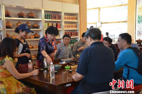遊客在臺灣美食工藝品館開心地泡茶。(劉雨 攝)