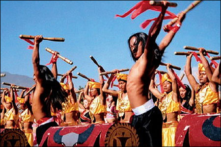 木鼓舞由四部分組成,舞蹈首先展現了,由巫師“魔巴”帶領全村健壯剽悍的阿佤男子,以藤條捆綁已選擇好的巨大樹幹後,在騎于樹幹 “魔巴”的一路領唱下,拉木人邊踏歌為節,邊迎合高呼地拉木前進直達村寨的歌舞。這段古樸而粗獷的歌舞“拉木鼓”,氣氛神聖莊嚴,舞步自然成韻,極具原始崇拜意味。