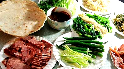 立春季節,春回大地,大蔥已出嫩芽稱羊角蔥,鮮嫩香濃,吃春餅抹甜面醬,卷羊角蔥,稱為“咬春”。但北京人吃春餅更講究炒菜,它要韭黃、粉絲、菠菜切絲炒一下,拌和在一起,稱為和菜,卷春餅吃。另外還有春餅夾醬肘絲、雞絲、肚絲等熟肉的吃法,而且講究包起來從頭吃到尾,叫“有頭有尾”。