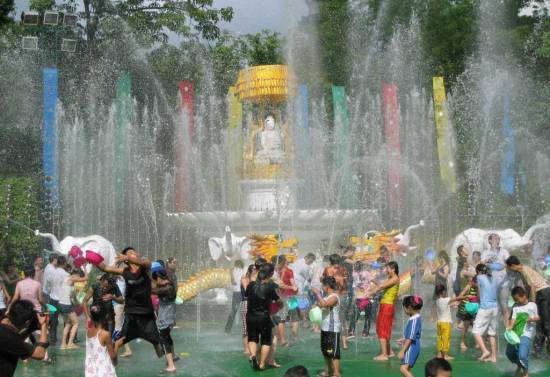 一群群青年男女用各種各樣的容器盛水,涌出大街小巷,追逐嬉戲,逢人便潑。文雅的則用樹枝蘸水潑。“水花放,傣家旺”,“潑濕一身、幸福終身”!象徵著吉祥、幸福、健康的一朵朵水花在空中盛開,人們盡情地潑盡情地灑,笑聲朗朗,全身濕透,興致彌高。入夜,村寨鼓樂相聞,人們縱情歌舞,熱鬧非凡。