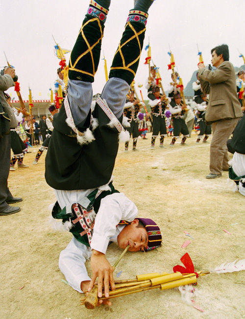 一般在節日之前要舉行儀式,先由某村德高望重的老人主持祭祖,與此同時,各家各戶都在自家自行祭祖,隨後各村各寨的姑娘穿著盛裝,佩戴銀花銀飾,小夥子和蘆笙手們都各自帶著蘆笙,從四方八面向蘆笙場地涌來,各村的男子青年都各自圍成圓圈,吹笙跳舞,持續四五天,氣氛十分熱烈,是一種融歌、舞、樂于一體的群眾性的文藝活動。