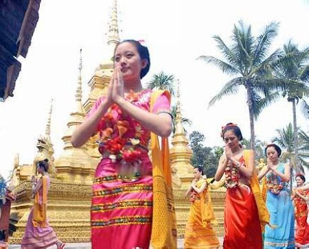關門節那天,傣家村寨充滿了節日的氣氛。一大早,家家戶戶都在忙著蒸彩色糯米飯和制作糕點,賧佛或饋贈親友,備辦酒席會餐。