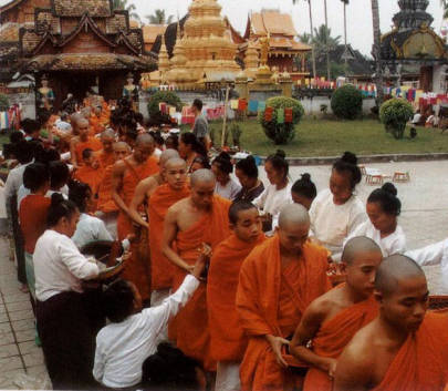 每年傣歷9月15日的這一天,布朗族全寨賧佛,到緬寺聽經、滴水。年滿40歲以上男女中老年人要住緬寺,全寨停止生產一天;晚上,青年擊鼓跳舞。三天後,將緬寺大門關門三個月,僧侶日夜誦經,禁出寺院。 傣歷的九月十五日淩晨,各村寨的佛寺都要擊鼓為號,告訴人們節日已到,村寨佛寺里的佛爺這一天要集中到佛寺念經,百姓要做齋飯送到佛寺內讓僧侶們享用。各村寨的老年信徒也要到佛寺去滴水、納佛。民間的信徒也到佛寺中靜坐參佛,聽佛爺講經說法,每隔七天舉行一次“賧佛”活動,以食物、鮮花、銀幣、紙幣等獻佛。這段日子禁止人們外出,禁止青年男女談情說愛和結婚,以便集中精力搞好生產。