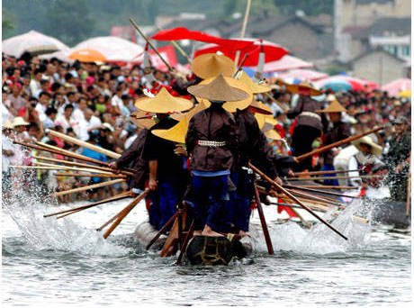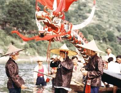 時到中午,三聲號炮一響,數十只披紅挂彩的龍船在吆喝聲中破浪前進。鑼鼓聲、鞭炮聲、呼嘯助威聲此起彼伏,把整個節日推向高潮。勝利者最後可得一面錦旗。