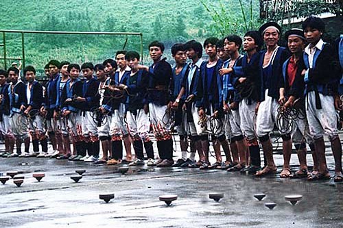 瑤山白褲瑤人過大年最喜歡、最熱鬧的娛樂活動是賽陀螺。因而,瑤山人把春節也叫陀螺節。